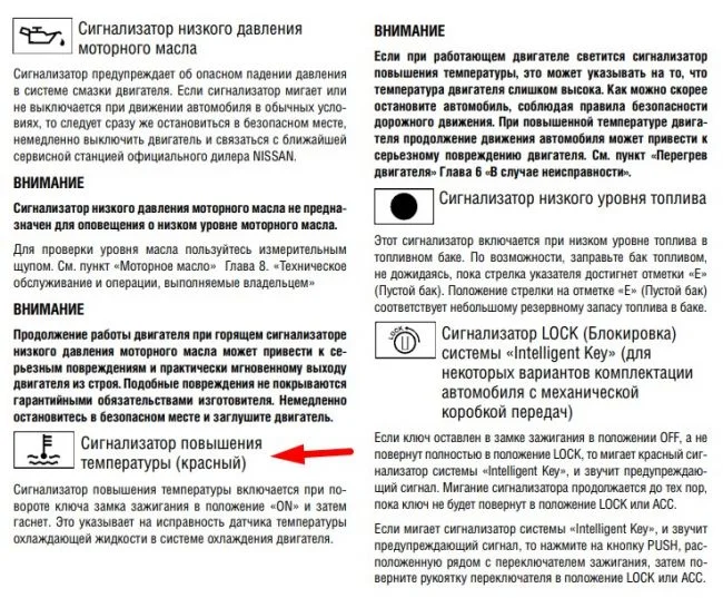 Чаще значок синий и красный, но судя по отзывам, вместо синего горит зеленый, это означает, что двигатель не прогрет, а если красный загорится, значит перегрев двигателя. Ниже выдержка из руководства, так же можете почитать тут.