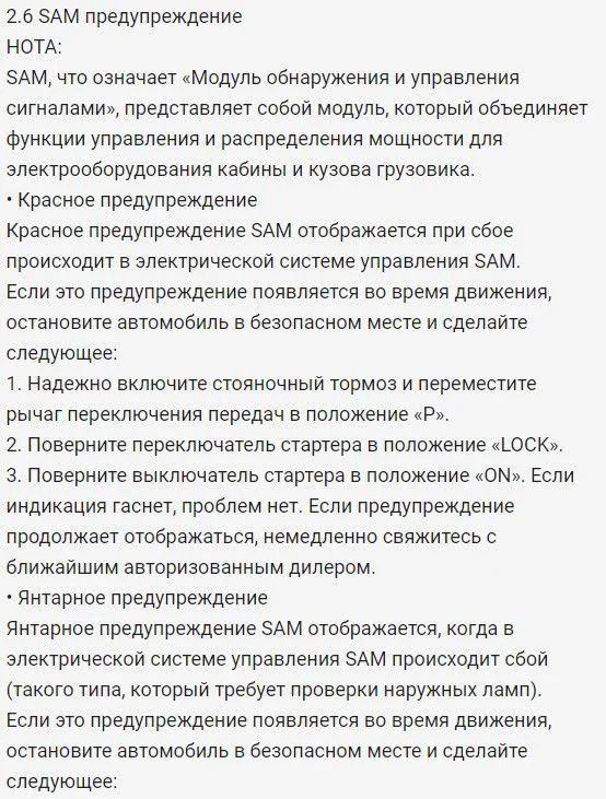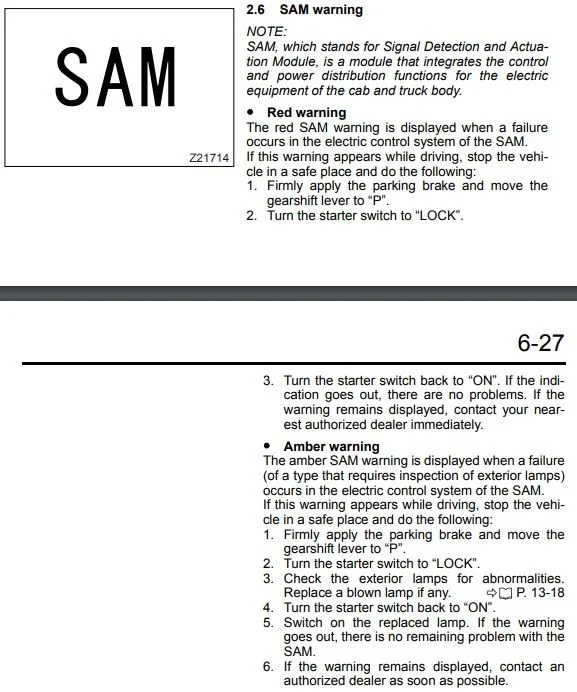Если горит желтый значок SAM, то это значит, что не горит лампа снаружи, если красная лампа, то проблема в электронном блоке управления кузовным оборудованием (блок предохранителей). Дословный перевод ниже.