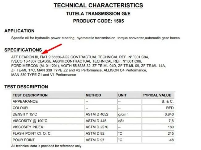 Производитель рекомендует заливать жидкость TUTELA GI/E с артикулом Fiat 15051616, во многих каталогах указывается, что жидкость имеет спецификацию Dexron III, вот ее технические характеристики: