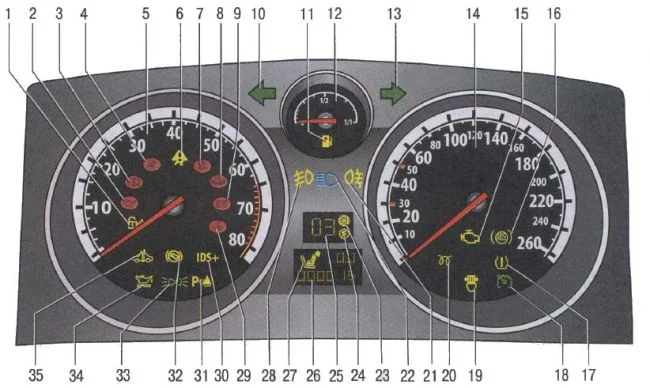 34) Сигнальная лампа недостаточного уровня масла в двигателе;