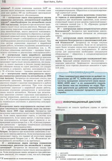 Ниже выдержка из инструкции по эксплуатации автомобиля с описанием всех контрольных ламп на панели приборов Опель Зафира А.