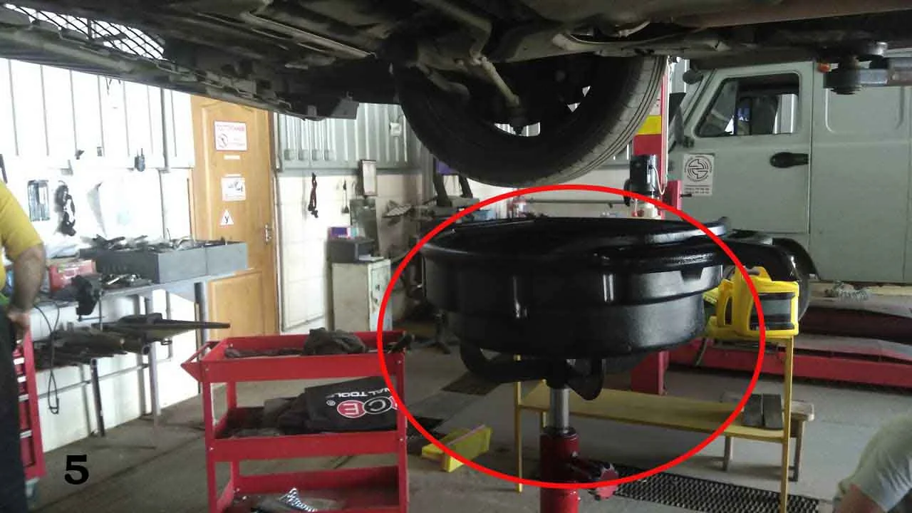 - Снова используем телескопическую стойку, поставив на нее поддон на 10 л для слива масла.
