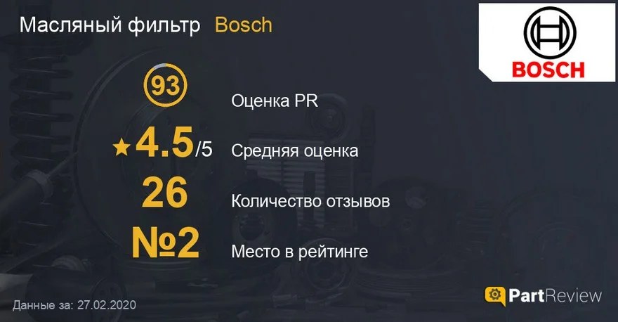 Кстати, судя по вашим отзывам, в зависимости от страны и региона, ситуация с ценовым позиционированием “боша” обстоит по-разному. Потому что кто-то отмечает среди недостатков высокую цену, а кто-то говорит, что берет их из-за доступной цены по сравнению с оригиналом и премиум-фильтрами. Так что если в вашем регионе масляные фильтры Bosch — это средний ценовой сегмент, их можно смело ставить на свой автомобиль. Особенно если и в оригинале у вас стоял “бош”, что тоже часто бывает.
