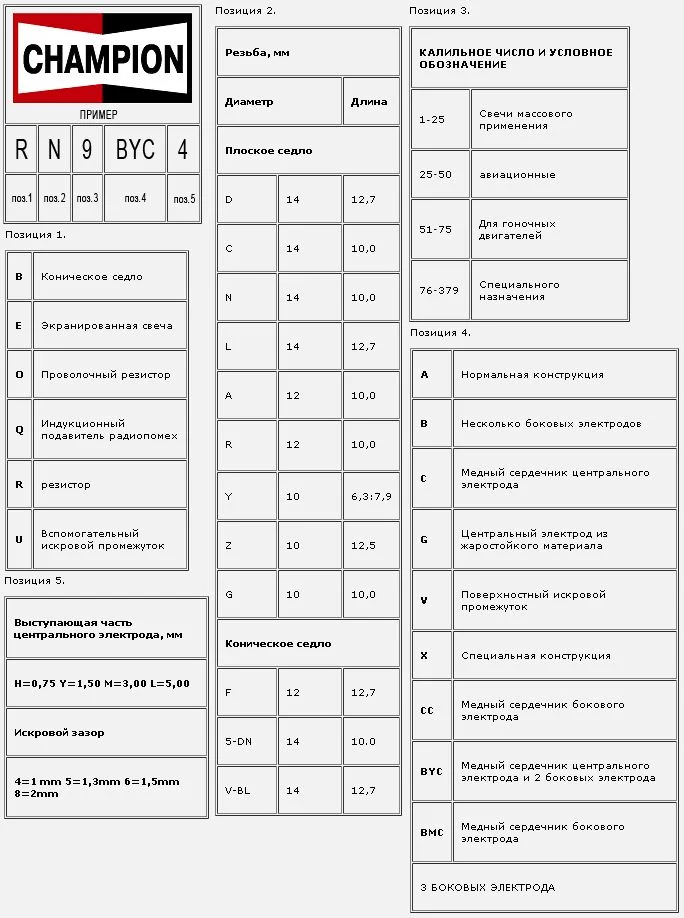 Особенности конструкции электродов у свечей «Чемпион» зашифровано в виде буквенных символов. Расшифровываются они следующим образом: