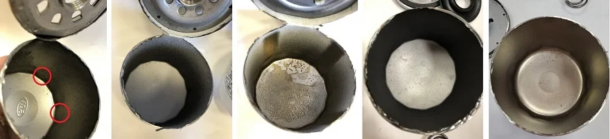 Состояние колб внутри, слева направо: SCT, Marshall, Mann, Mahle, Ford