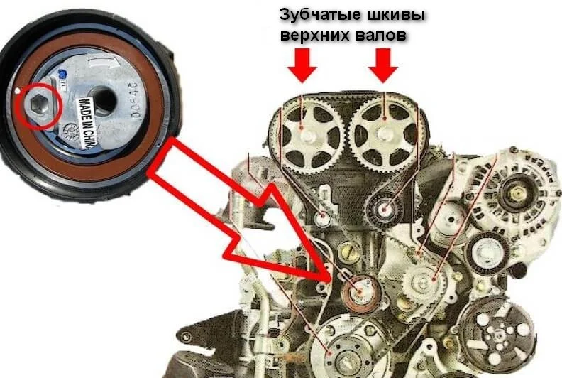Теперь, на натяжном ролике ослабляется болт крепления, после, пользуясь шестигранником поворачиваем внутреннюю часть до тех пор, пока ремень не ослабится. Все, ГРМ можно снимать.
