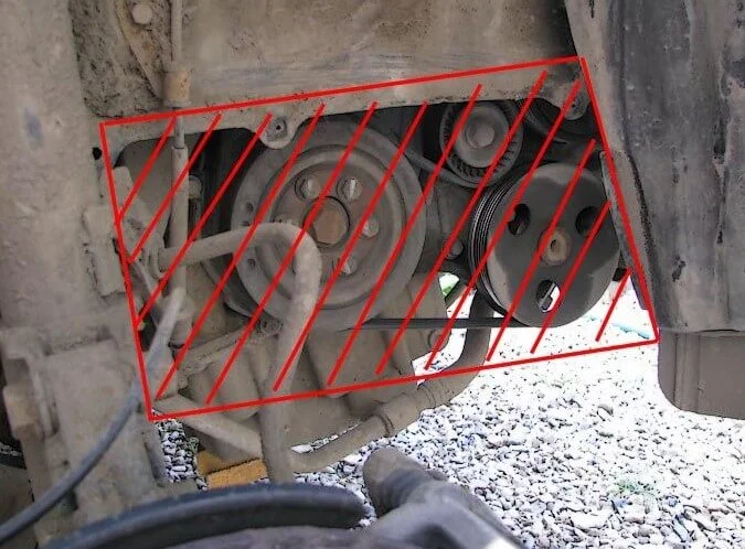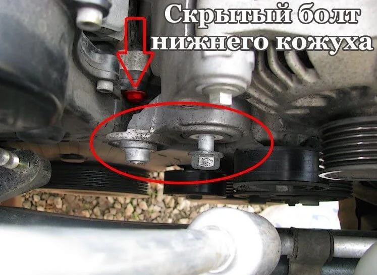 Сняв натяжной ролик, открывается доступ к нижнему болту кожуха ГРМ.