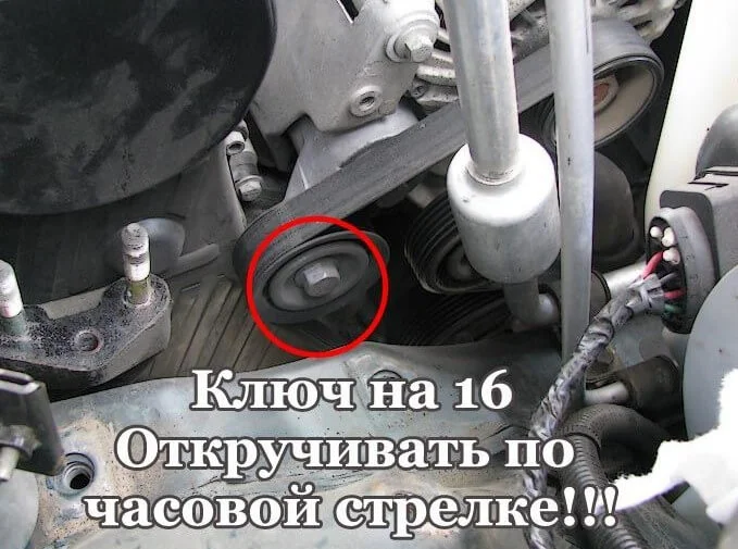 Теперь пользуясь ключом на 16 снимаем ролик и поликлиновый ремень.