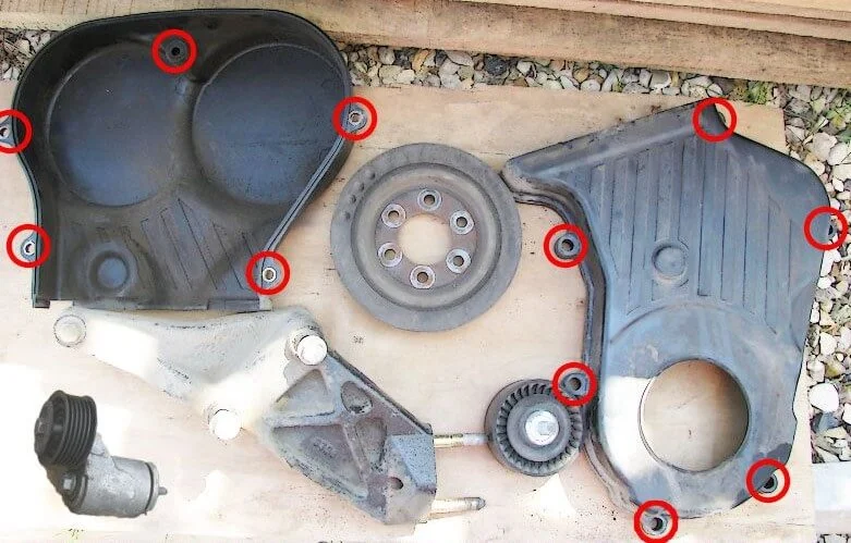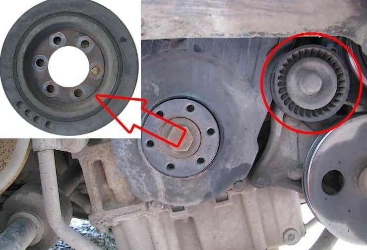 Открутить 6 болтов по кругу, чтобы снять шкив коленвала, центральный болт откручивать не нужно, и снимаем обводной ролик, выкрутив его центральный болт.
