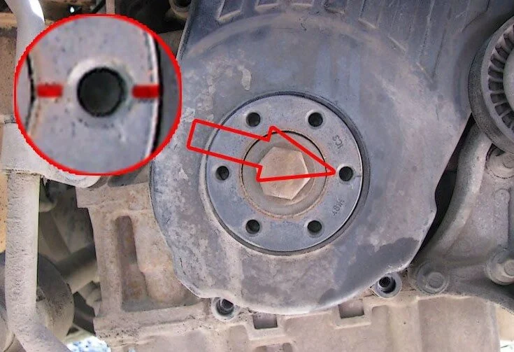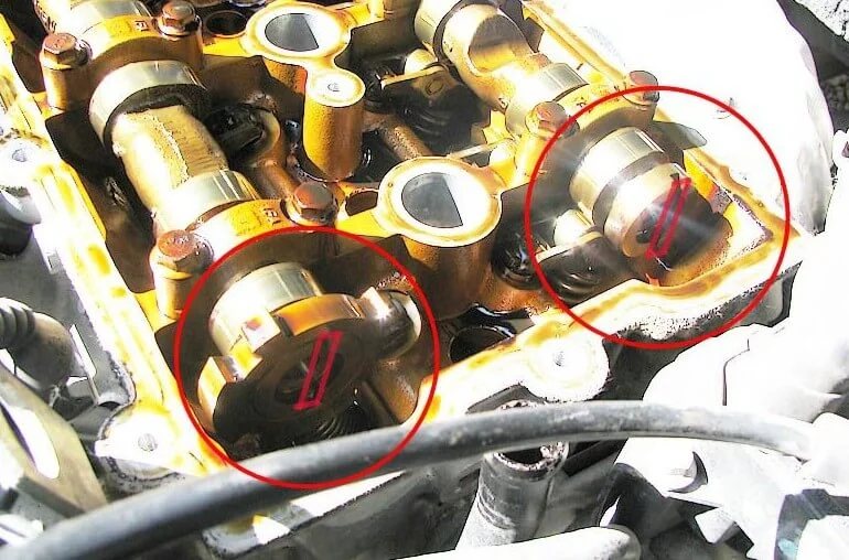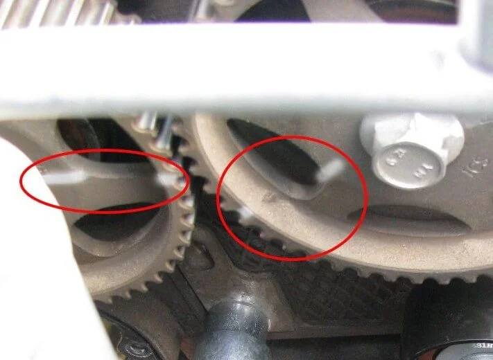 Задача такова, Вам потребуется выставить горизонтально метки на распредвалах ГРМ так, чтобы зубчатые шкивы переместились до точки в которой маленькие метки совпадут.