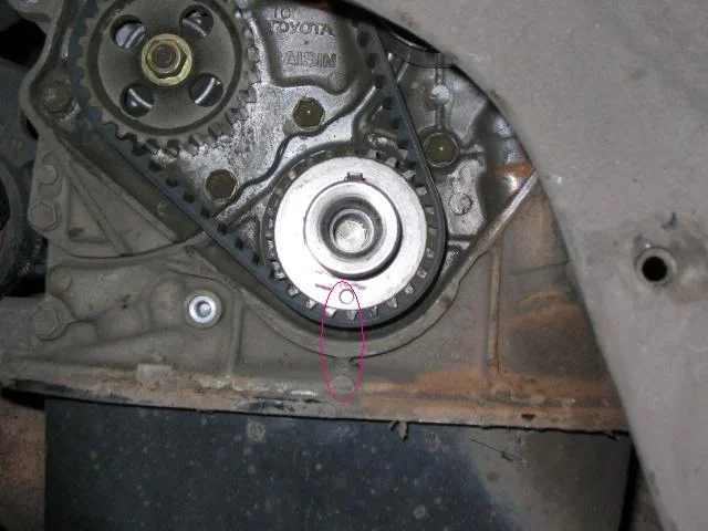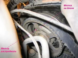 Для того, чтобы убедиться в совпадении меток звёздочки распредвала можно так, берем зеркальце и смотрим через него в дырочку звездочки, если все правильно, то можно будет увидеть метку на блоке.