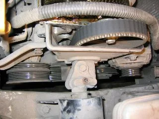 После того, как натяжение ремня ослабится, аккуратно снимаем ремень. Не дергайте и не крутите ремень.