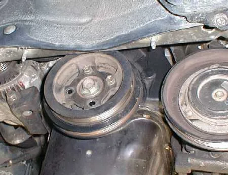 Как ремни сняты, начинаем выкручивать болты шкива, их четыре, после шкив снимается, теперь предстоит выкрутить центральный болт ведущего шкива. Все делается аккуратно, так как можно случайно крутануть коленвал. Если у Вас МКПП то включаем любую передачу, а если автомат, то придется искать прорезь, она находится позади двигателя в маховике, она предназначена для снятия гидромуфты.