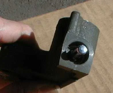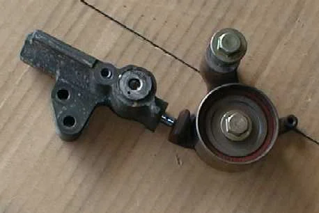Та самая штука в середине натяжителя и есть шток натяжного ролика. Желательно сразу внимательно осмотреть, нет ли на ней следов масла или смазки. Шток вставляют в паз при помощи пресса, он фиксируется шплинтом в корпусе натяжителя.