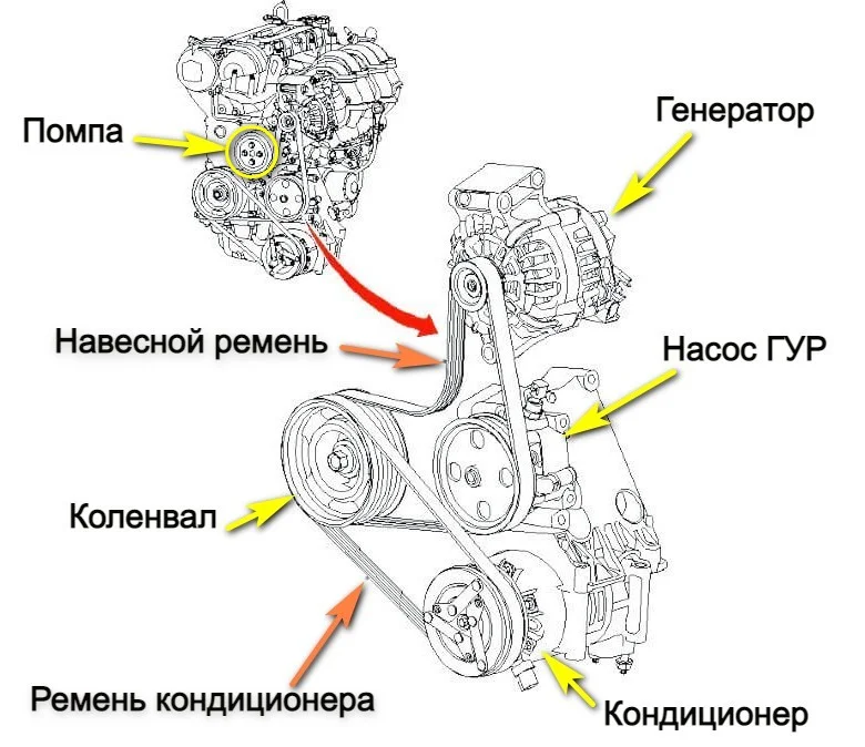 Воспользуемся схемой, чтобы представлять как расположен ремень и какие приборы он объединяет.