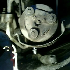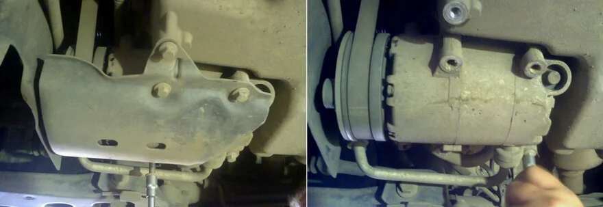 - прикручиваем назад компрессор, но тут есть одно но. Когда ставится обратно старый ремень, то компрессор получится прикрутить на место без проблем, а если же новый, не растянутый, ремешок, то возможно может так гладко и не получится.