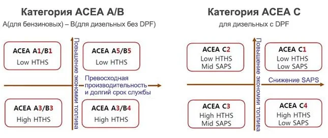 ACEA — Европейская ассоциация автомобильных производителей, в которую входят BMW, DAF, Ford of Europe, General Motors Europe, MAN, Mercedes-Benz, Peugeot, Porsche, Renault, Rolls Royce, Rover, Saab-Scania, Volkswagen, Volvo, FIAT и другие. В соответствии со стандартом масла делятся на три большие категории: