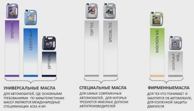 Компания Liqui Moly выпускает свои масла, исходя из требований для конкретного двигателя внутреннего сгорания, в частности, под допуски конкретных автопроизводителей. Например, это можно видеть по популярной серии TOP TEC, о которой речь пойдет ниже.