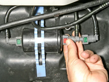 - Устанавливаем новый топливный фильтр на Рено Логан 1 в обратной последовательности, сначала одевая патрубок с зеленой кнопкой, а затем с красной.
