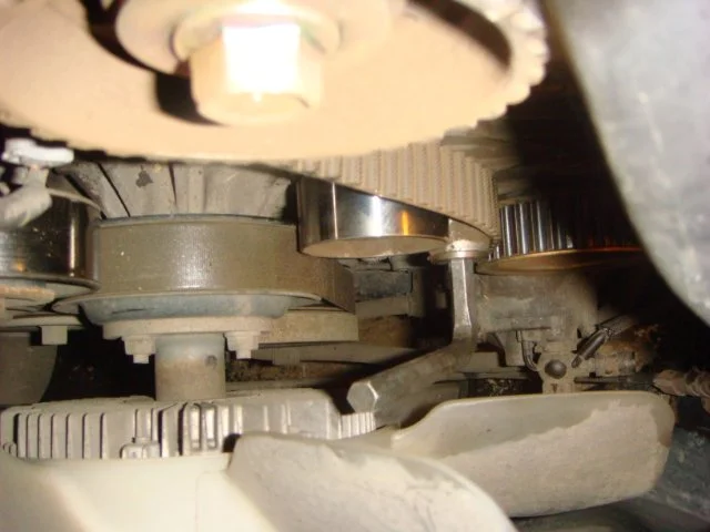 На шкиве ТНВД штатной метки я не обнаружил, но зато присутствовала метка, оставленная прежним владельцем. Как метки будут совмещены, нужно открутить натяжитель и ролик.