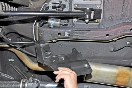 Замена топливного фильтра Шевроле Нивы выпускавшихся после 2006 года, в том числе и уже новой 2017 г.в. начинается со снятия защитного кожуха у заднего правого колеса. Под ним находится сам фильтр. После снятия кожуха, крепежные элементы желательно очистить и смазать, поскольку в этом месте болты быстро начинают ржаветь.