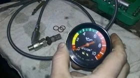 Проверка датчика давления. Если вы опытный водитель и подозреваете глюк датчика (уровень в норме, мотор работает ровно без посторонних звуков), можно проверить сам датчик. Часто он течет или с него слетает клемма. Точную проверку давления делают механическим манометром, вкручивая его вместо датчика. Если манометр показывает норму — меняйте датчик. Если давления нет — нужен ремонт мотора.