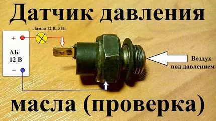 Для проверки электрического (нового) датчика давления масла вместо мультиметра можно воспользоваться лампочкой, рассчитанной на работу под напряжением 12 В постоянного напряжения, а также блока питания (аккумулятора) и компрессора (желательно с манометром). Алгоритм проверки следующий: