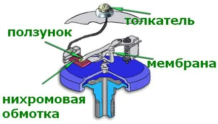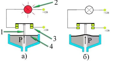Устройство электрического ДДМ. 1 — шток, 2 — сигнальная лампа, 3 — контакты, 4 — мембрана