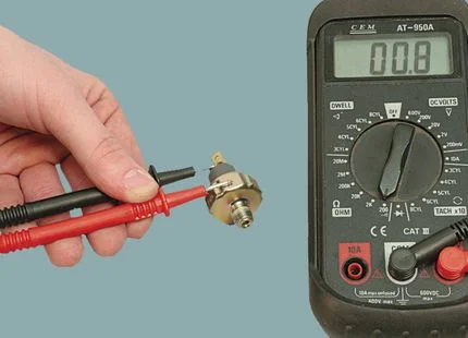- Одновременно с этим с помощью насоса подать на датчик давление воздуха около 1…1,5 атмосфер. Сильно дуть не нужно, чтобы не повредить мембрану. Если датчик исправен, то электрическая цепь разомкнется почти сразу, под механическим воздействием штока, находящемся в жесткой связи с изгибаемой чувствительной мембраной датчика давления масла.
