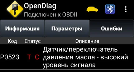 В зависимости от характера проблемы в память могут вносится коды ошибок датчика давления моторного масла: P0520, P0521, P0522, P0523 и P0524. В режиме реального времени вы можете подключиться к блоку управления и посмотреть наличие ошибок, а также показание датчика давления масла (напряжение на датчик и температуру масла). Что позволит более точно определиться с причиной неисправности.