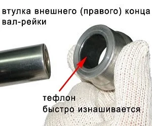 Первое слабое место – тефлоновая втулка. На первый взгляд, конструкция рулевой рейки продумана. Надежность фиксации втулки в стальном картере обеспечивается за счет ее самоцентрирующейся конструкции и запирания пружинным кольцом. Но ее соединение с вал-рейкой осуществляется через тефлоновую прокладку. А тефлон, как известно, имеет рыхлую структуру и недостаточно высокий уровень износостойкости.