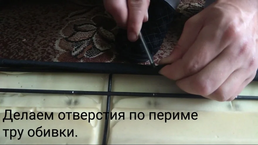 - Также делаем отверстия по контуру обивки и соединяем хомутами с корпусом.