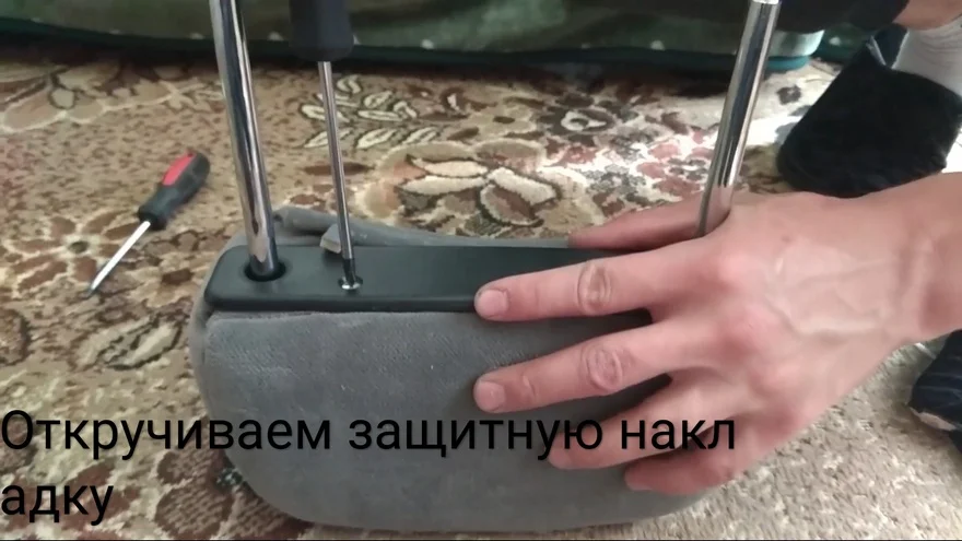 Подголовники. Откручиваем защитную накладку, поддеваем обивку и снимаем с крючков. Спицы из старой обивки вставляем в новую, натягиваем ее и зацепляем за крючки. Прикручиваем накладку обратно.