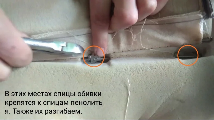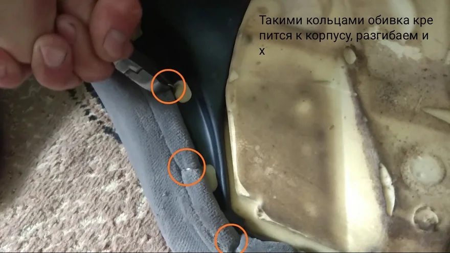 - Старая обивка крепится к корпусу при помощи стальных колец, разгибаем их. Если будите пробовать их перекусывать, то это довольно трудоёмкое занятие. Поэтому просто бокорезами крутите кольцо, по часовой стрелке, и оно снимется. Если не получается, используйте плоскогубцы.