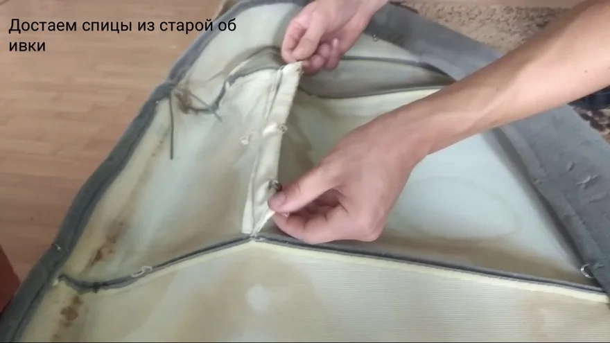 - Снимаем старую обивку, достаем спицы и вставляем в новую.