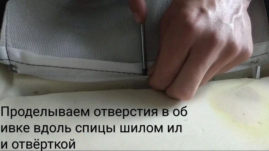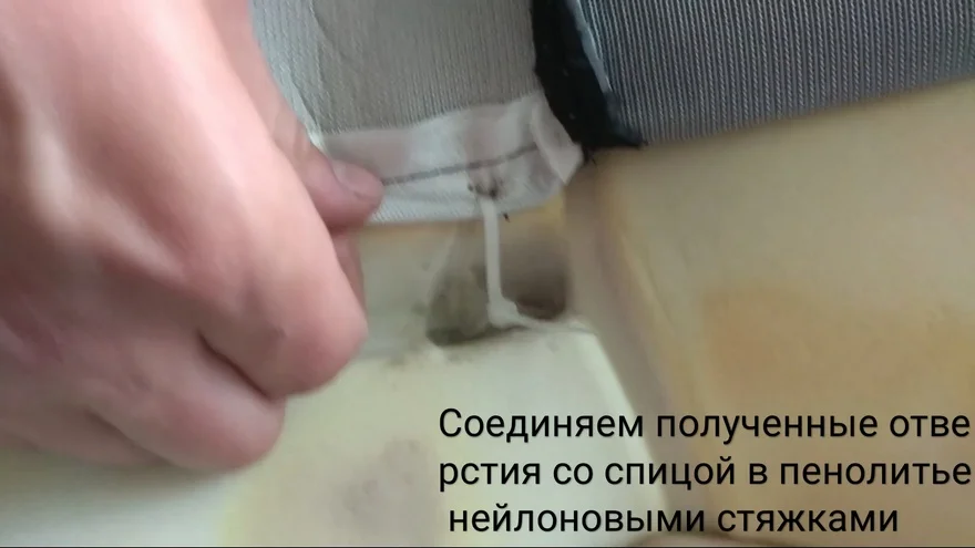 - Проделываем отвёрткой или шилом отверстия в обивке вдоль спицы и соединяем стяжкой проделанные отверстия со спицей в пенолитье.