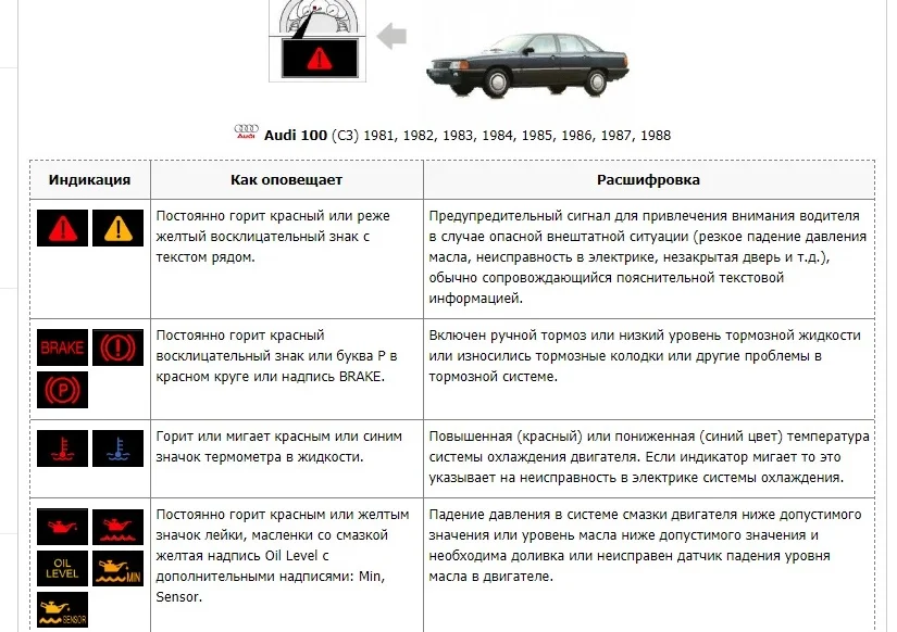 На панели приборов у меня на Ауди 100 (с3) 1983 г/в, в первый раз в жизни за 22 года эксплуатации автомобиля, загорелся значок синего цвета с градусником, во время заводки и прогрева на повышенных оборотах холодного двигателя . По таблице неисправностей пишется следующее - Горит или мигает красным или синим значок термометра в жидкости. Ответ: Повышенная (красный) или пониженная (синий цвет) температура системы охлаждения двигателя. Если индикатор мигает то это указывает на неисправность в электрике системы охлаждения. Двигатель при заводки всегда холодный и это естественно, но никогда ранее синим цветом значок не загорался, а сейчас загорается даже при заглушенном двигателе при включении зажигания. Естественно я автомобиль заглушил и не прогревал и больше не заводил, из-за этого аварийного значка загоревшего постоянным синим цветом, отменив поездку. Кто знает причину и что мне делать подскажите пожалуйста.