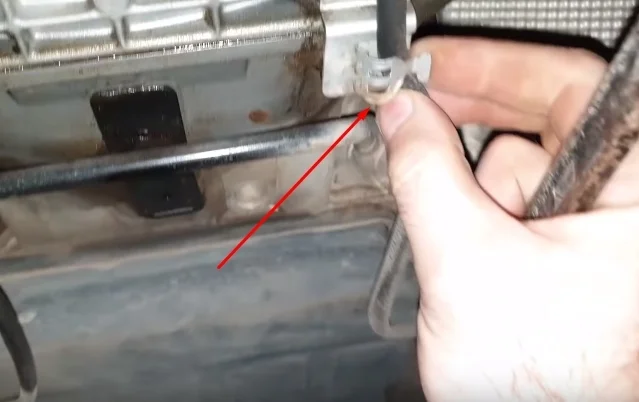 - Устанавливаем автомобиль на яму и для начала вынимаем провод питания датчика из металлического фиксатора.