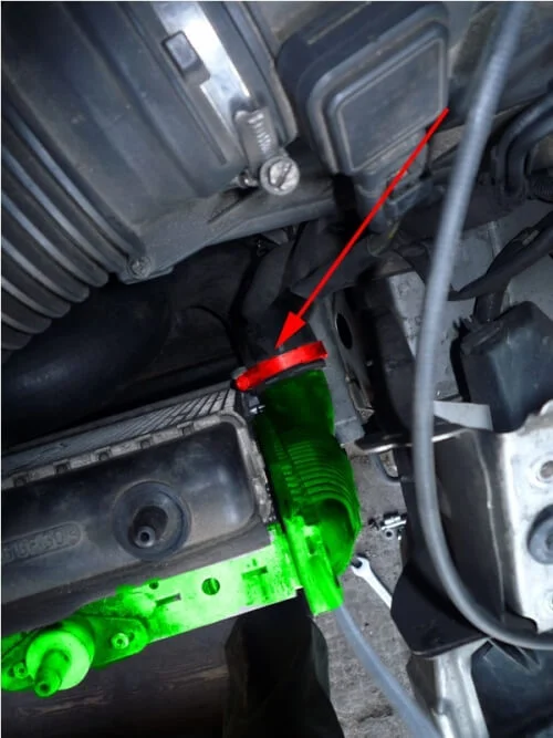 Начинаем снимать впускной патрубок передних цилиндров. Патрубок зажимается 2-мя хомутами.
