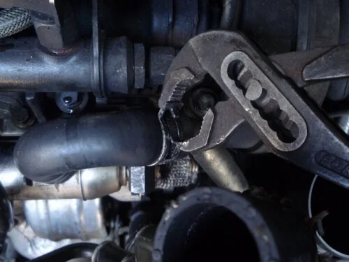 Пользуясь головкой №8, на радиаторе нужно ослабить хомуты патрубков.