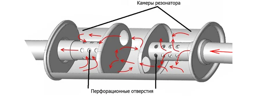 Внутренние полости имеют неодинаковый объем с тем, чтобы обеспечивать периодическое сужение и расширение потока отработанных газов, что в свою очередь дает выравнивание их неравномерной пульсации. То есть, каждая камера имеет свою резонансную частоту. Кроме этого они имеют небольшое смещение относительно оси корпуса. Это необходимо для достижения смены направления потока выхлопов. А внутренняя перфорация на трубе нужна для гашения большой амплитуды звуковых волн, которые вырабатывают газы.