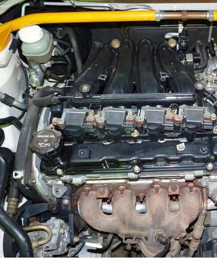 Первым нужно снять выпускной коллектор, предварительный катализатор интегрирован в нём: