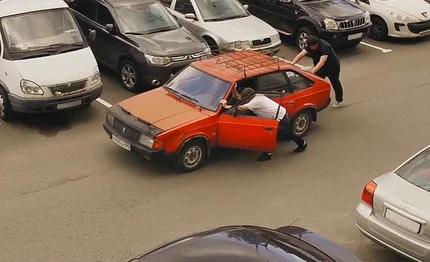 - Становимся возле открытой водительской двери, упираемся в стойку и толкаем.