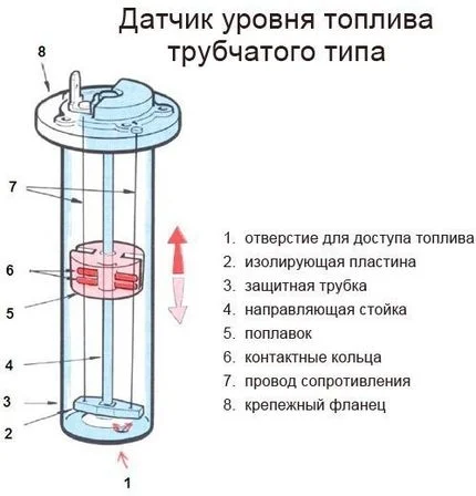 - Расположенный внутри трубки поплавок имеет контактные кольца и при движении по трубке с изменением уровня топлива в баке изменяется и сопротивление. Измерение сопротивления происходит по одному или двум контактных проводах расположенных вдоль направляющей трубки.