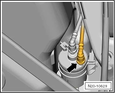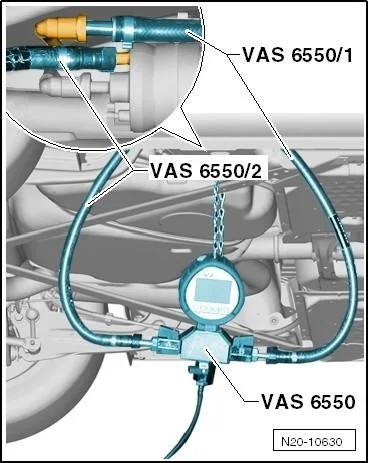 - Подсоединить между топливным фильтром и напорным топливопроводом манометр -VAS 6550- с переходниками -VAS 6550/1- и -VAS 6550/2-;