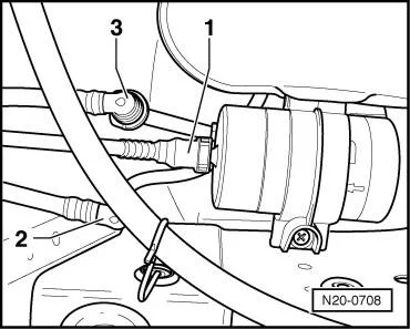 - Отсоединить обратную -2- (синяя) и подающую топливную магистраль -1- (чёрная) и шланг вентиляции -3- (белый);