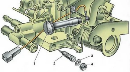 Элементы, которые позволяют непосредственно произвести регулировку холостого хода: винт регулирующий состав смеси, а так же винт 1 регулирующий количество смеси. Винт 2 закрывается заглушкой 4. Чтобы добраться до него, понадобится открутить заглушку.