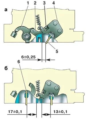 Чтобы проверить, полностью ли открыты дроссельные заслонки, нужно повернуть рычаг привода до упора. Отрегулировать величину максимального открытия заслонки 1-ой камеры можно путем подгибания нижнего усика рычага 3. Величина, характеризующая максимальное открытие заслонки дросселя второй камеры равна (17±0,1 мм), данную величину можно регулировать закручиванием или откручивание штока пневмопривода.