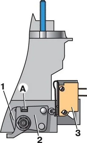 На рис. 2 изображено правильное положение микропереключателя: 1 — рычаг, закрепленный на оси заслонки дросселя 1-ой камеры; 2 — рычажок привода заслонок; 3 — микропереключатель; А — усик 1-го рычага