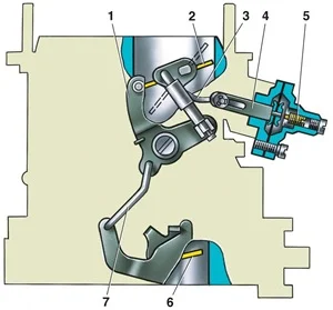 На рис. 3 изображен привод пускового уст-ва карбюратора 2107: 1 — рычаг отвечающий за управление воздушной заслонкой; 2 -воздушная заслонка; 3 — тяга пускового устройства; 4 — шток; 6 — заслонка дросселя первой камеры; 5 — винт регулировки; 7 — тяга привода заслонки.